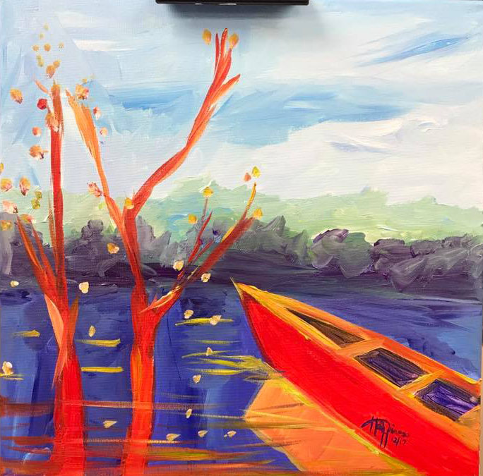 Serenity is the message in this painting. A canoe drifts beside a shrub on the still water bank. You can make the color your own and let it speak to you. We’ll create this painting using a very easy beginner friendly technique that’ll amaze you. Yes, you can do it – Guaranteed!